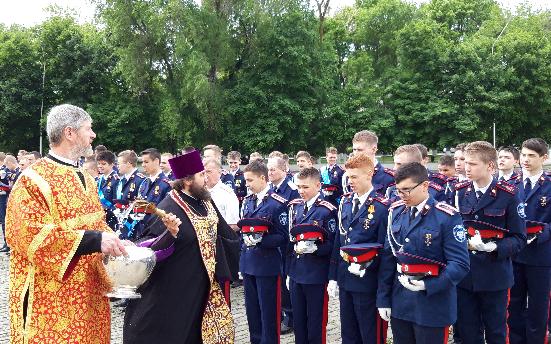 По старинной казачьей традиции войсковым священником был совершен молебен, по окончании которого протоиерей Георгий Сморкалов, член попечительского совета корпуса и настоятель соборного храма окропил кадетов, их родителей и педагогический состав учебного заведения святой водой.