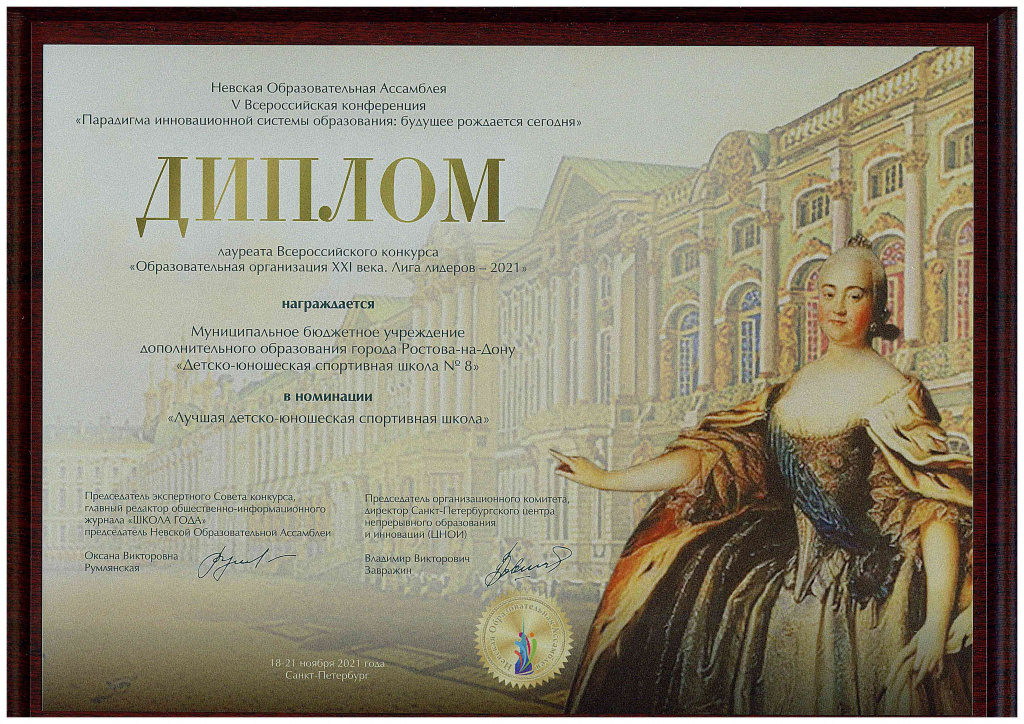 Ростовская ДЮСШ № 8 стала лауреатом конкурса в номинации «Лучшая детско-юношеская спортивная школа», а директор школы Олег Замятин награжден Памятным знаком «Эффективный руководитель-2021».