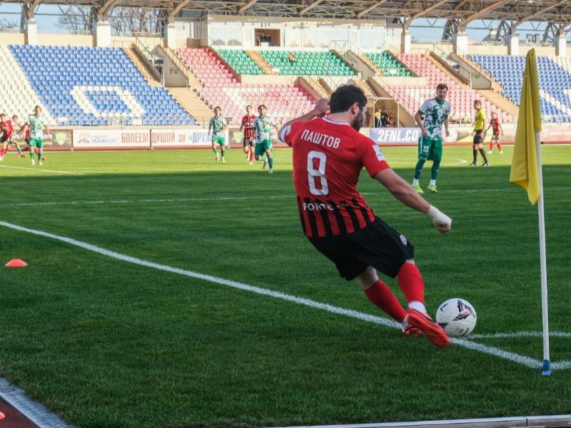 Футболисты «Форте» отправились столицу Адыгеи, чтобы сразится за звание лучших. С первых минут было ясно, что именно таганрогская команда является фаворитом игры. Уже на пятой минуте игры Иван Погребняк открыл счёт. Руслан Паштов навесил с углового, а Погребняк перевисел всех в воздухе и отправил мяч в сетку, 0:1. Далее на какое-то время игра успокоилась. До перерыва голов не было.