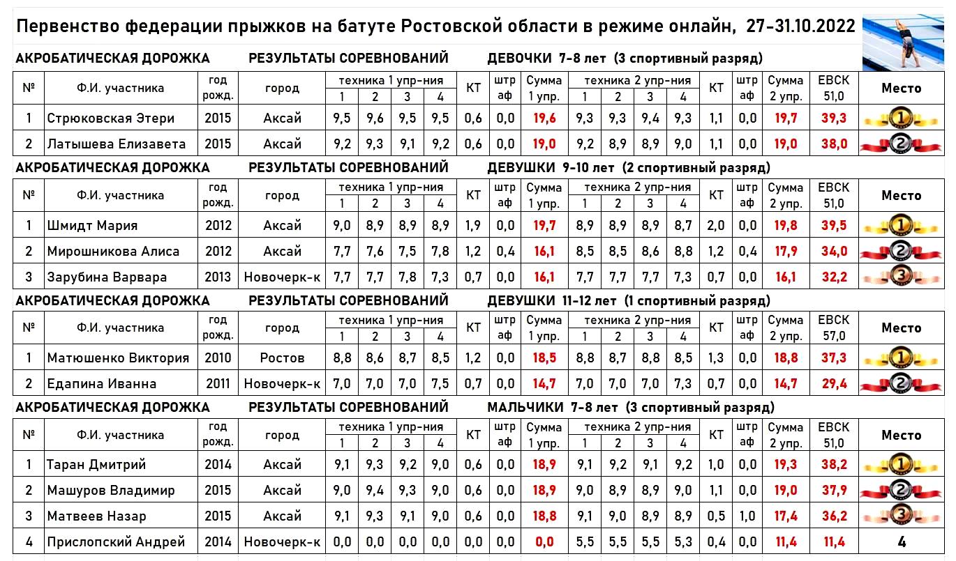 ПОДВЕДЕНЫ ИТОГИ ПЕРВЕНСТВА ФЕДЕРАЦИИ ПРЫЖКОВ НА БАТУТЕ РОСТОВСКОЙ ОБЛАСТИ В ПРЫЖКАХ НА АКРОБАТИЧЕСКОЙ ДОРОЖКЕ (16.11.2022)