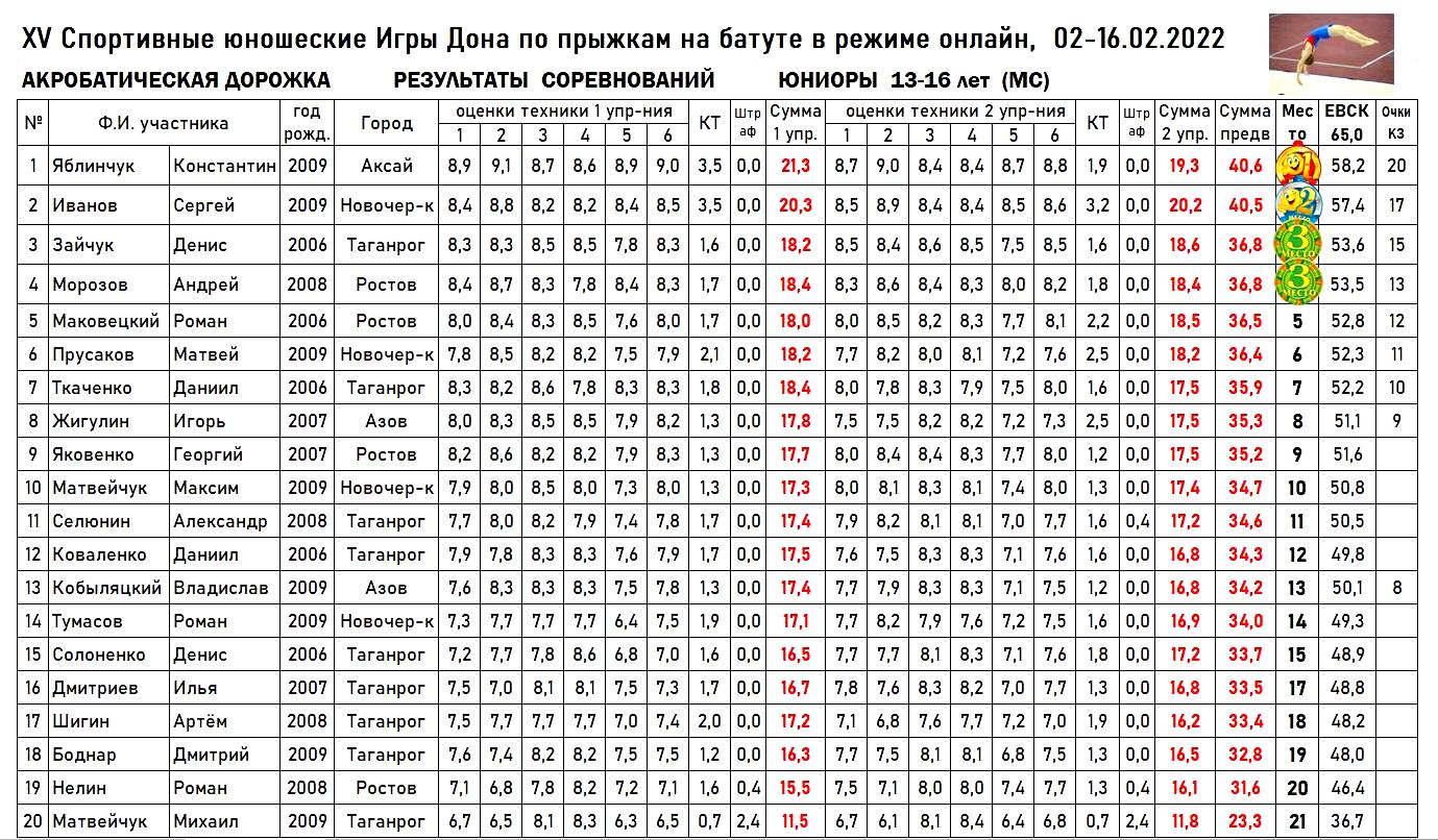 Протоколы: Чемпионат Ростовской области командный-2022 (Батут, Синхрон, ДМТ) АКД-финал 1 (юниорки 13-16) ХV Спортивные юношеские Игры Дона-2022 АКД-финал 2 (юниорки 13-16) ХV Спортивные юношеские Игры Дона-2022