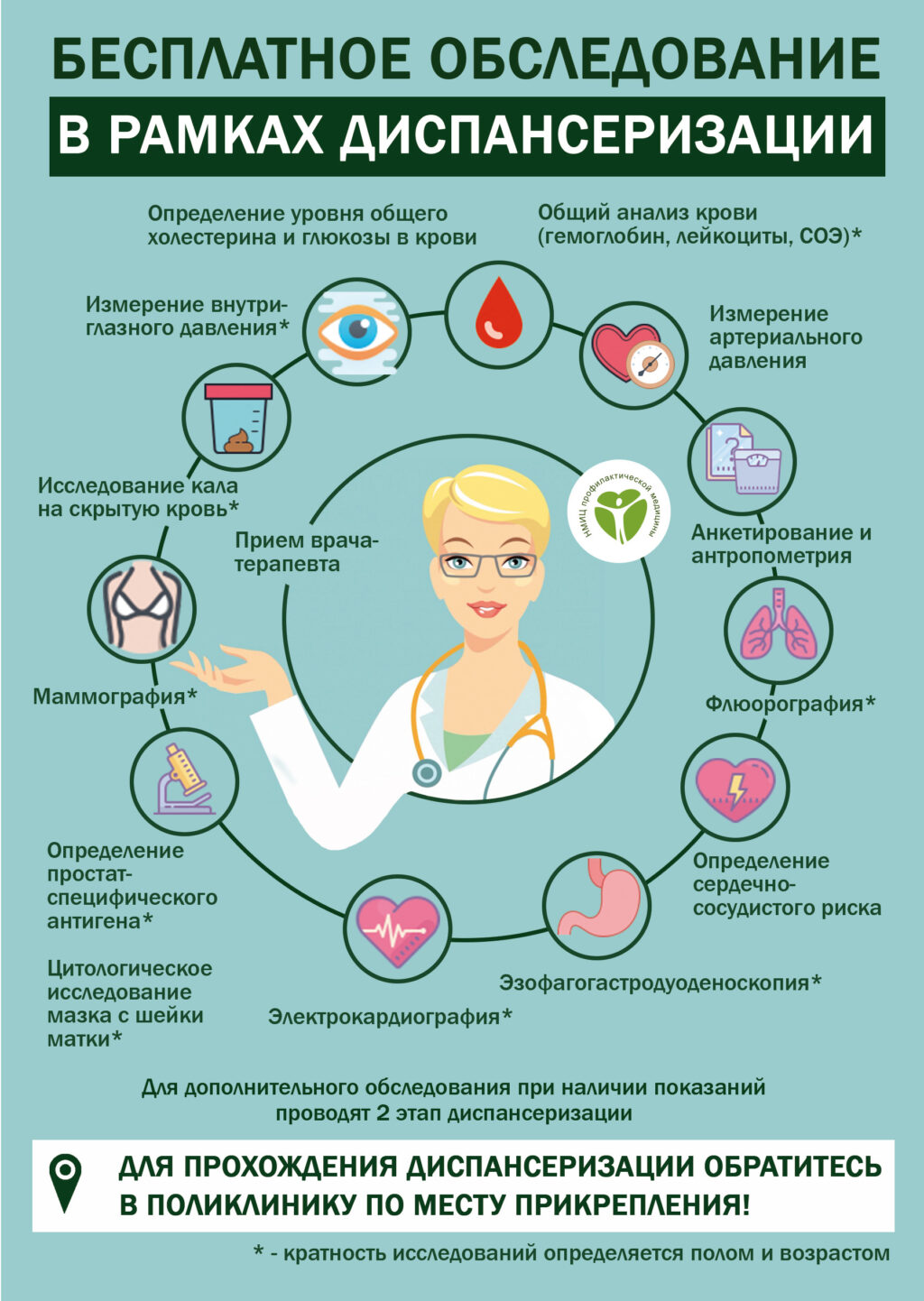 Диспансеризация проводится бесплатно в рамках национального проекта «Здравоохранение».