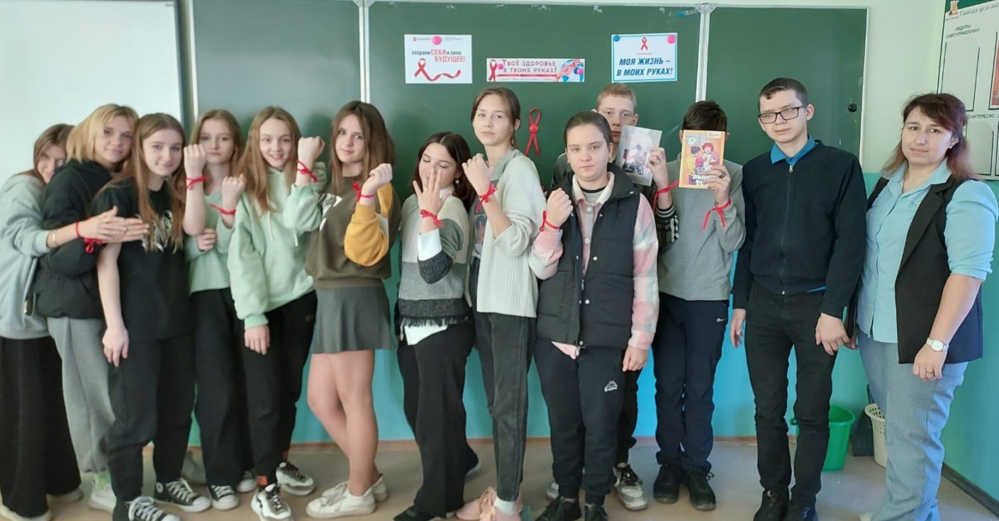 В конце мероприятия в знак солидарности школьники повязали на руку символ этого дня - красную ленту.