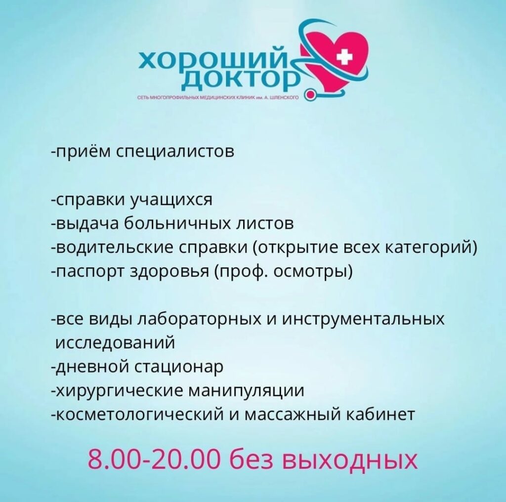 Качество лечения. Уровень сервиса. Индивидуальный подход к лечению. Скорость оказания услуг. Многопрофильность учреждений.Сеть медицинских клиник «Хороший доктор» им. А. Шленского занимается высококачественным лечением пациентов уже 10 лет. Современное оборудование, профессионализм врачей и широкий перечень услуг обеспечивают заботу о каждом человеке.