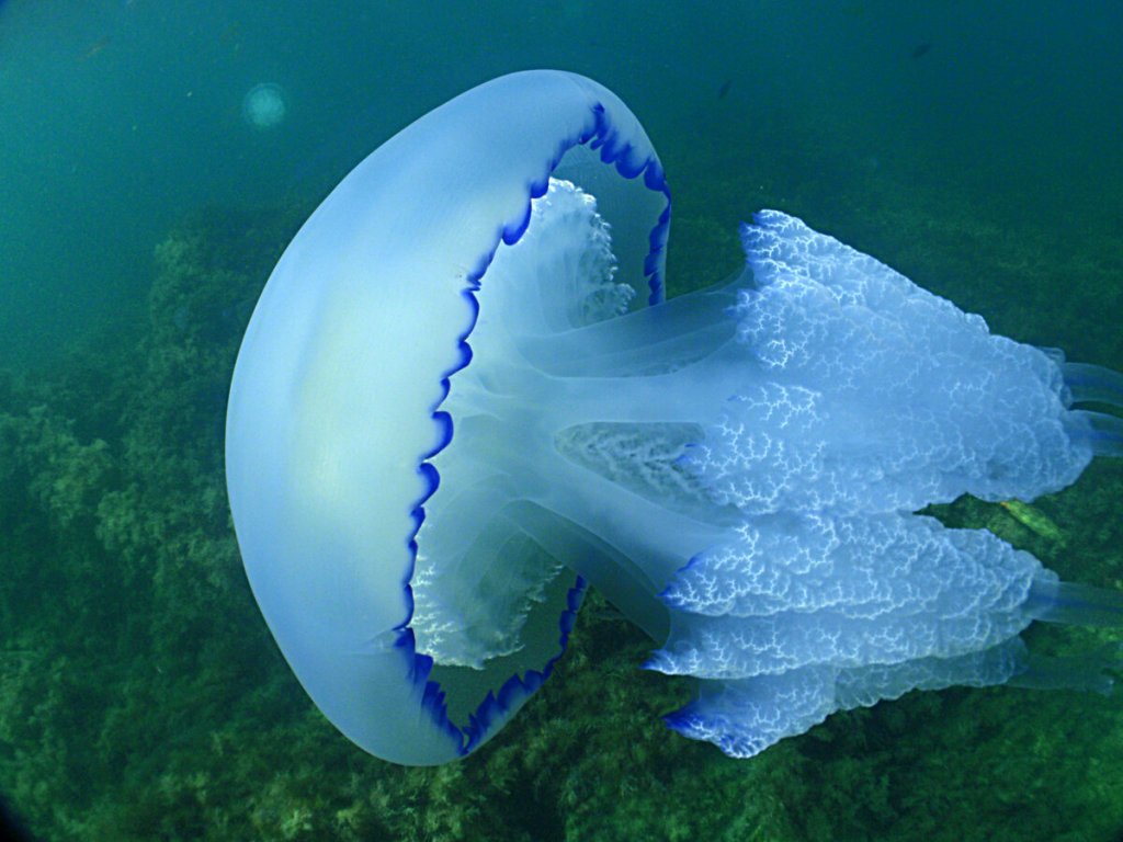 А вот третий вид медуз, корнерот, может доставить бОльшие неприятности. Кроме внушительных размеров, корнеротов отличают синий или фиолетовый цвет и массивные щупальца, которыми эти медузу и стрекают, подобно крапиве. В стрекательных клетках есть яд. Им корнерот парализует мелкую живность, которой и питается.