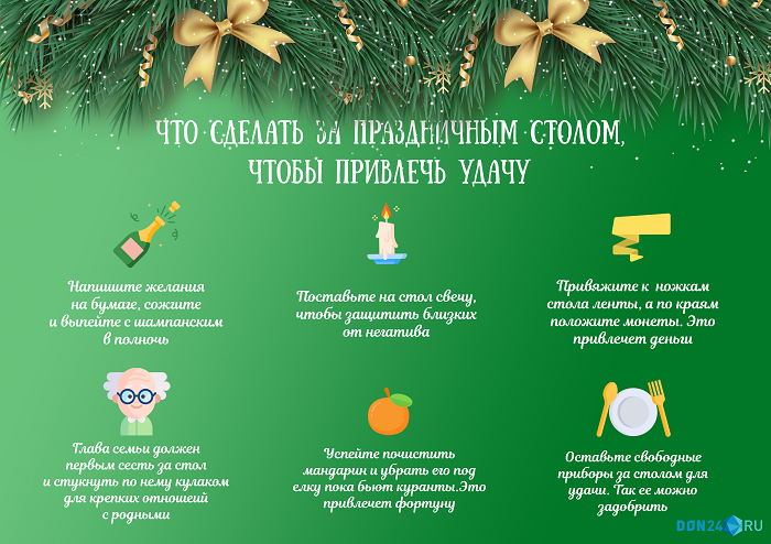 Петр Ростовцев ИА «ДОН 24» # Общество #Здоровье Поделиться: Как встретишь, так и проведешь: что сделать за праздничным столом, чтобы 2023 год был удачным 31.12.2022 Фото: Виктория Корнеева / don24.ru / АО «Дон-медиа» ©Ростовская область, 31 декабря 2022. DON24.RU. В народе существует много поверий о том, как стоит встречать Новый год, чтобы сохранить удачу. Корреспондент ИА «ДОН 24» собрал основные приметы для благополучия в 2023 году.