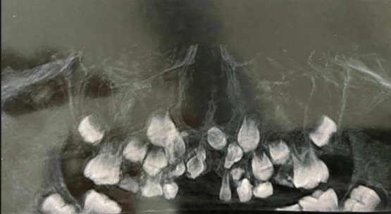 Во время обследования обнаружилось, что у пациента в верхней челюсти развитию обычных зубов препятствуют так называемые сверхкомплектные зубы необычной формы, расположенные в беспорядке.