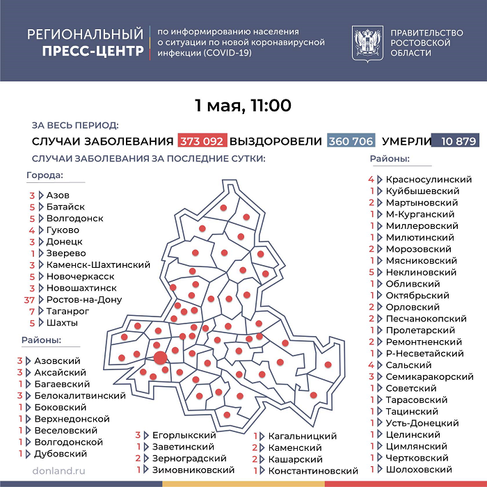 За все время пандемии на Дону зафиксировали 373092 случая заражения инфекцией. Коэффициент распространения заболевания – 0,71.